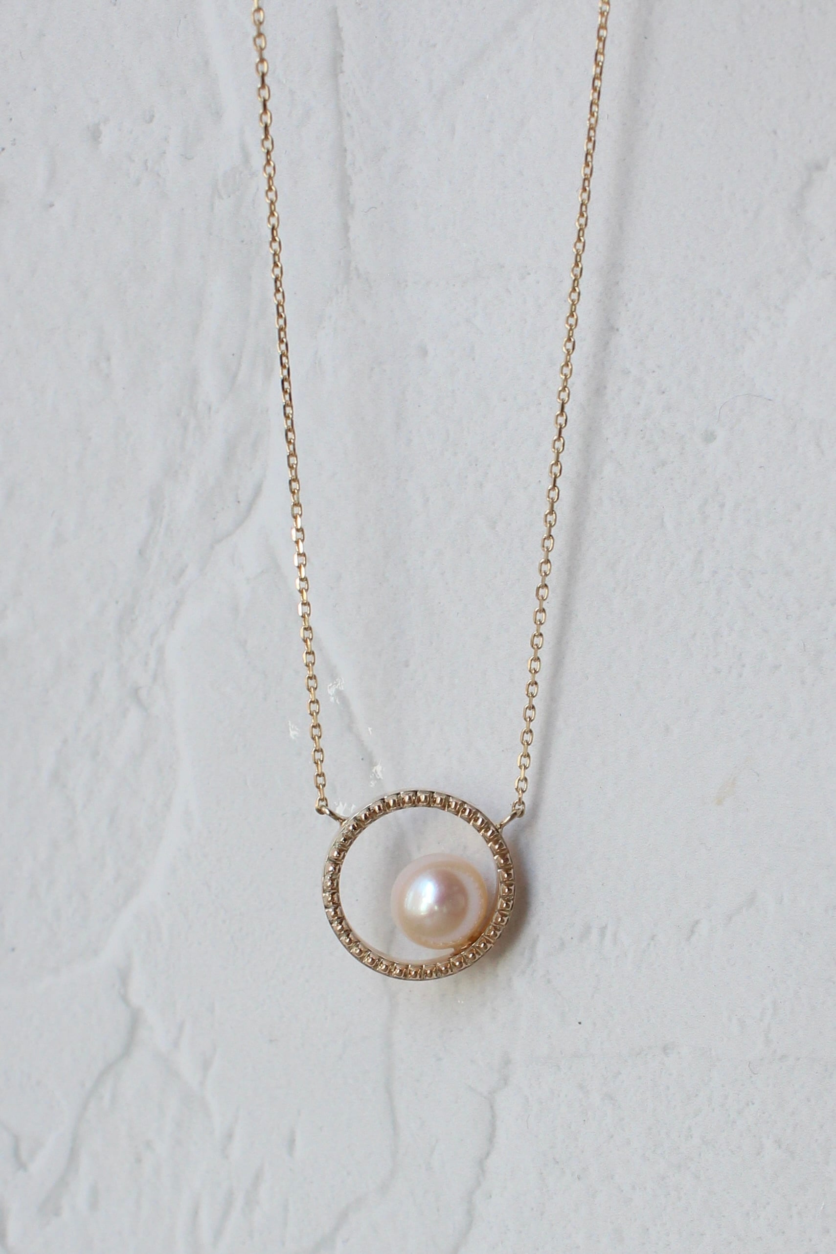 ネックレス及びチャームは10金を贅沢に使用し、大ぶりの淡水真珠を浮かべています。